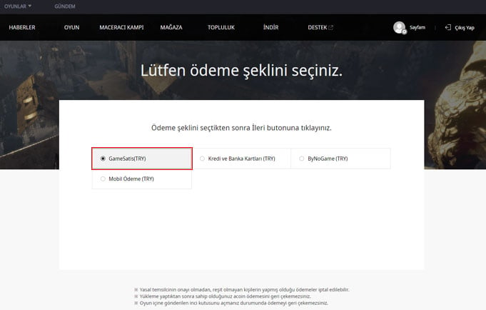 3.Ödeme yöntemlerinden "Gamesatis(TRY)" seçeneğine tıklayınız.