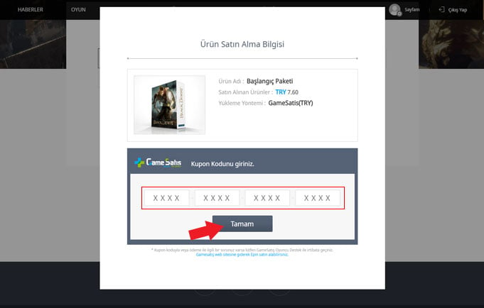 4.Satın aldığınız kodu ''Kupon Numarasını Girin'' kısmına yazarak ''Tamam'' butonuna basınız.